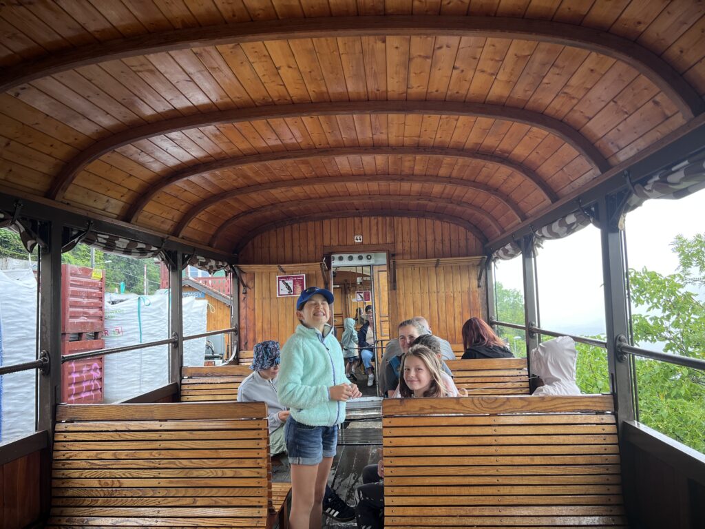 The plan was simple: a short train ride to Fontanivent, then a bus to Blonay to catch the steam train. Sabine, the girls, and cousins Sophia and Alexandre joined us, giving us a front-row seat to Sabine’s expert “cat herding” skills—keeping kids and adults moving on and off trains and buses like a seasoned professional. Just as we reached Blonay station, the skies opened up with a heavy rainstorm, but before long, the old steam engine came puffing into the station, and we climbed aboard—grateful to be (mostly) out of the rain.