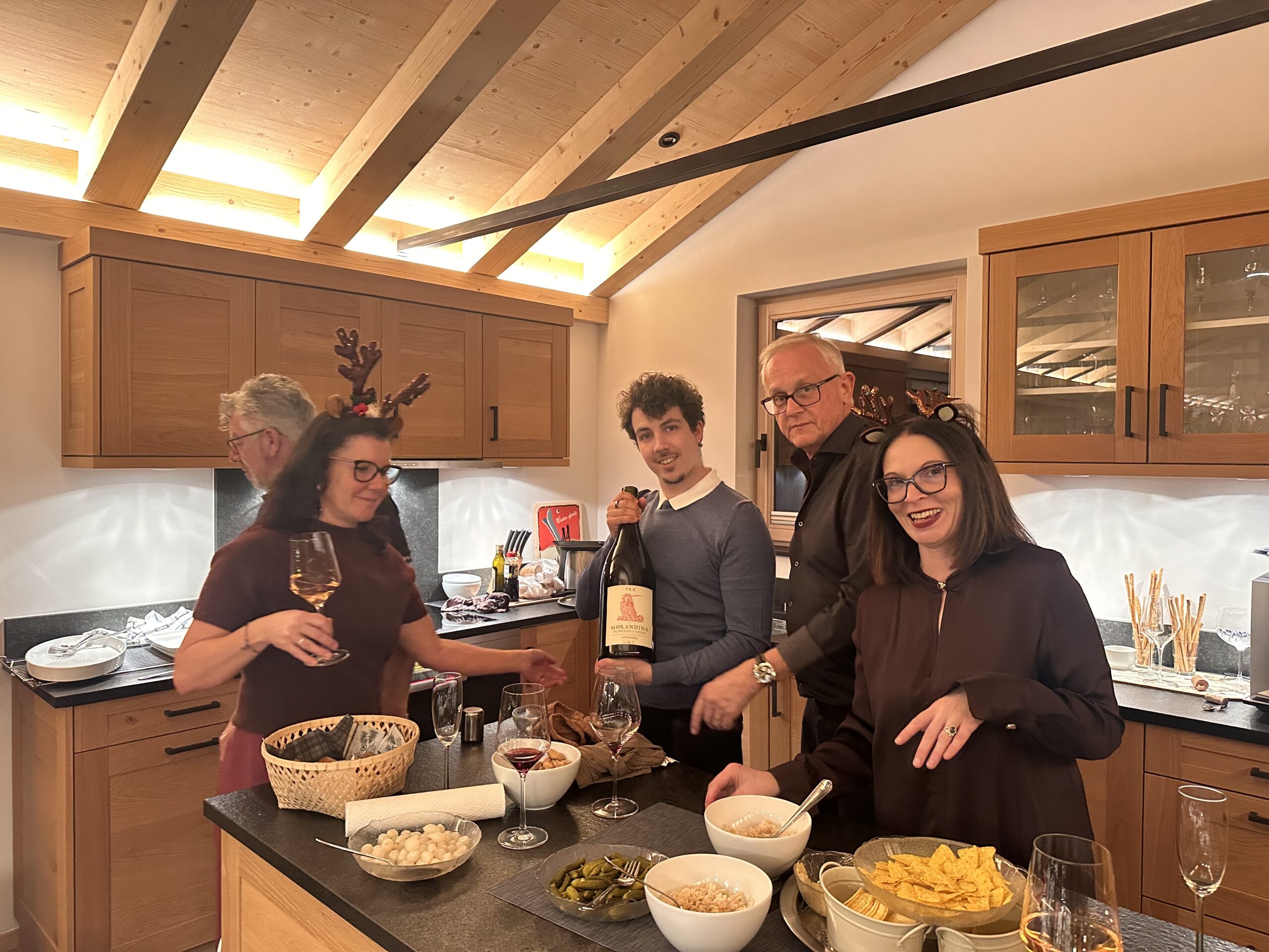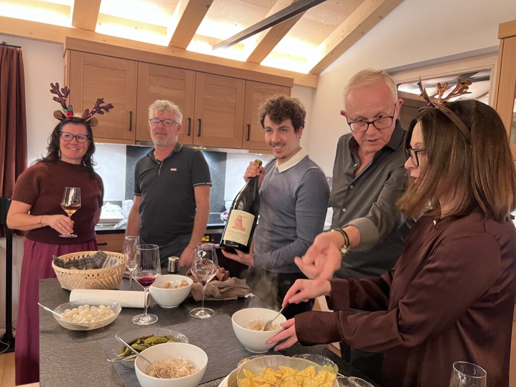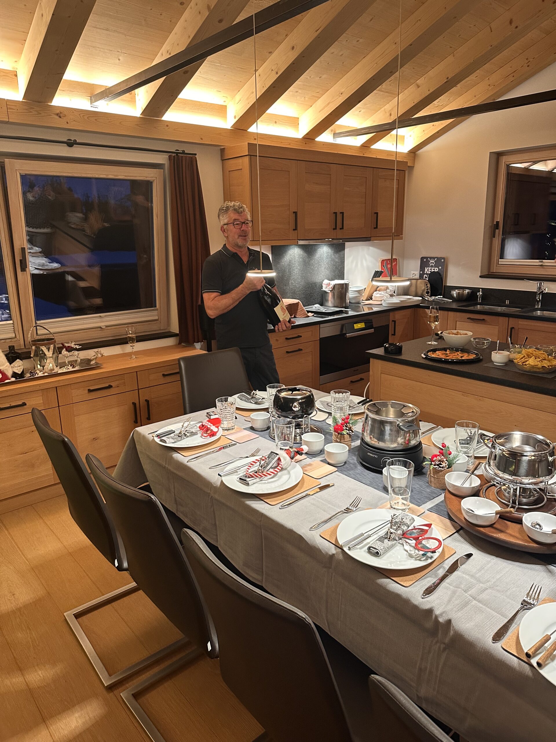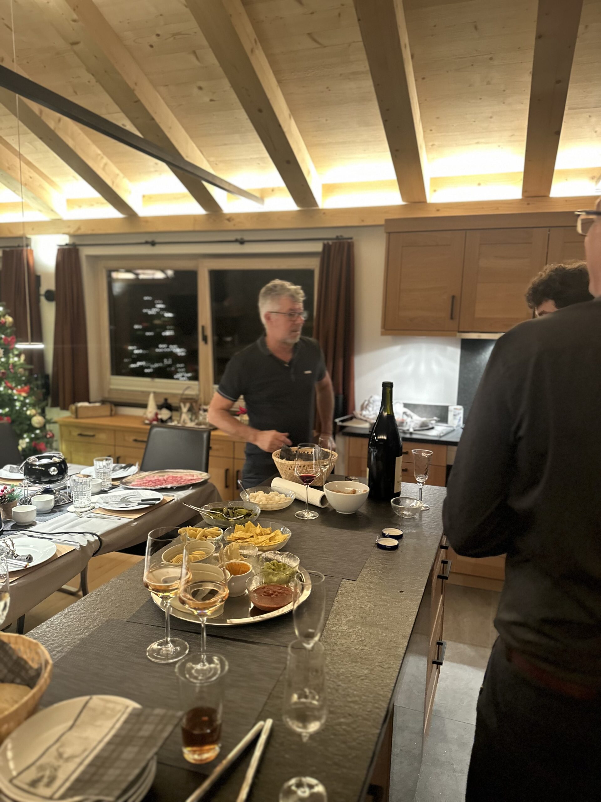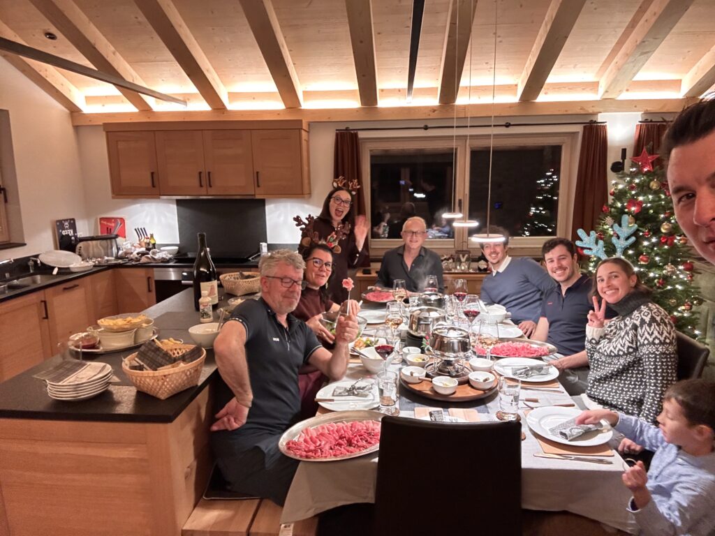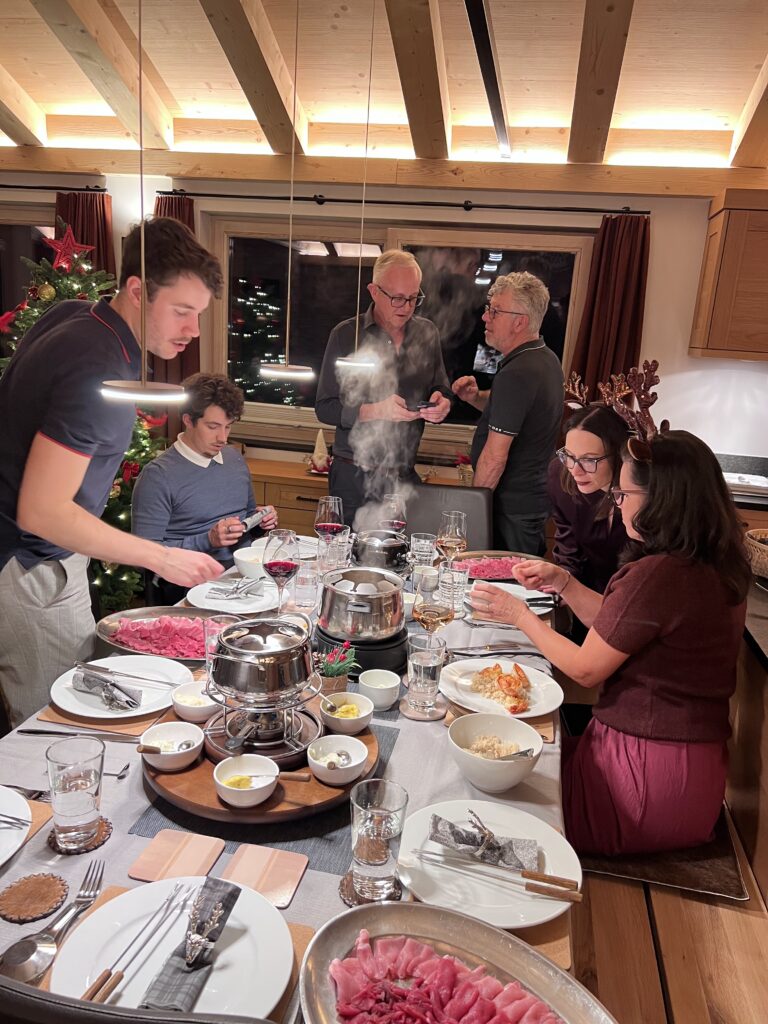 After a solid half-day of boarding, we headed home to get ready for the evening. We were joining the Barbieros at Paul and Karen’s chalet for Christmas Eve: apéro and fondue chinois.