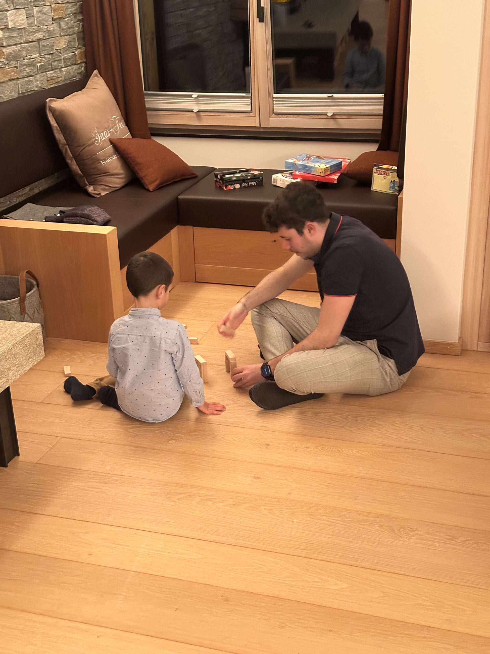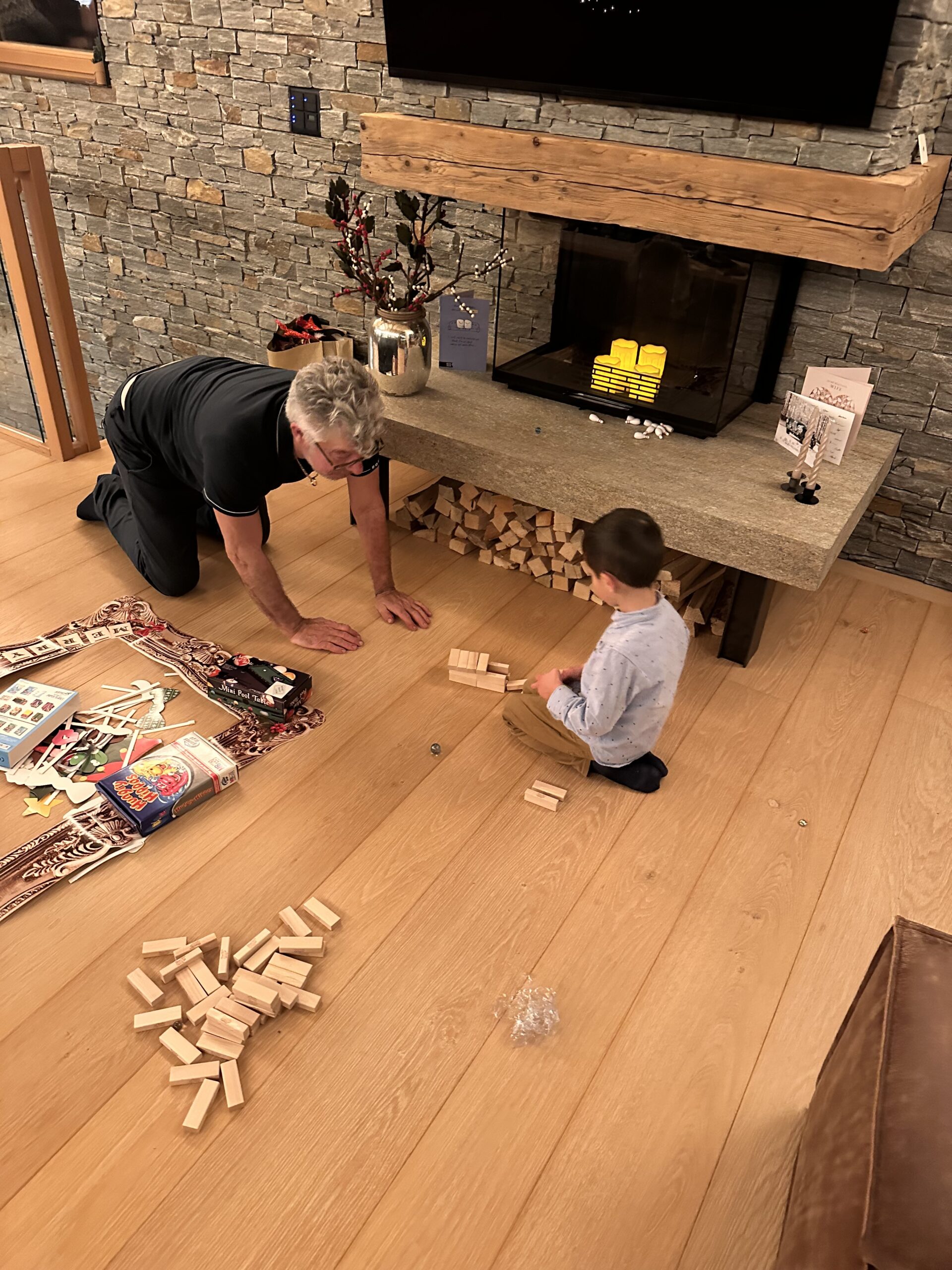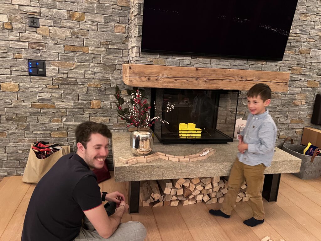 Cedar, Angelo, and Gabri were on the floor building LEGO, testing paper airplanes, sharing notes on aerodynamics. Andrea even joined in before the planes got launched off the balcony into the snow.