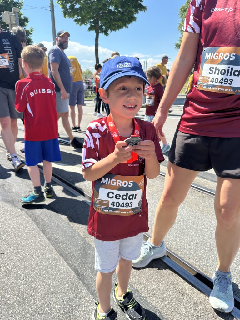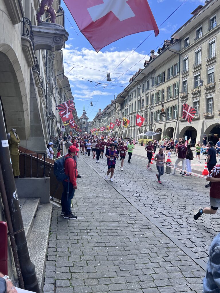 We weren’t sure how Cedar would handle it—especially in a crowd of 30,000 people (not all in our heat, thankfully)—but when the starter pistol went off, he was locked in. Took off like an airplane. If he’d been a bit more comfortable in the crowd, he probably would’ve left both of us in the dust, burning up the Bernese cobblestones.