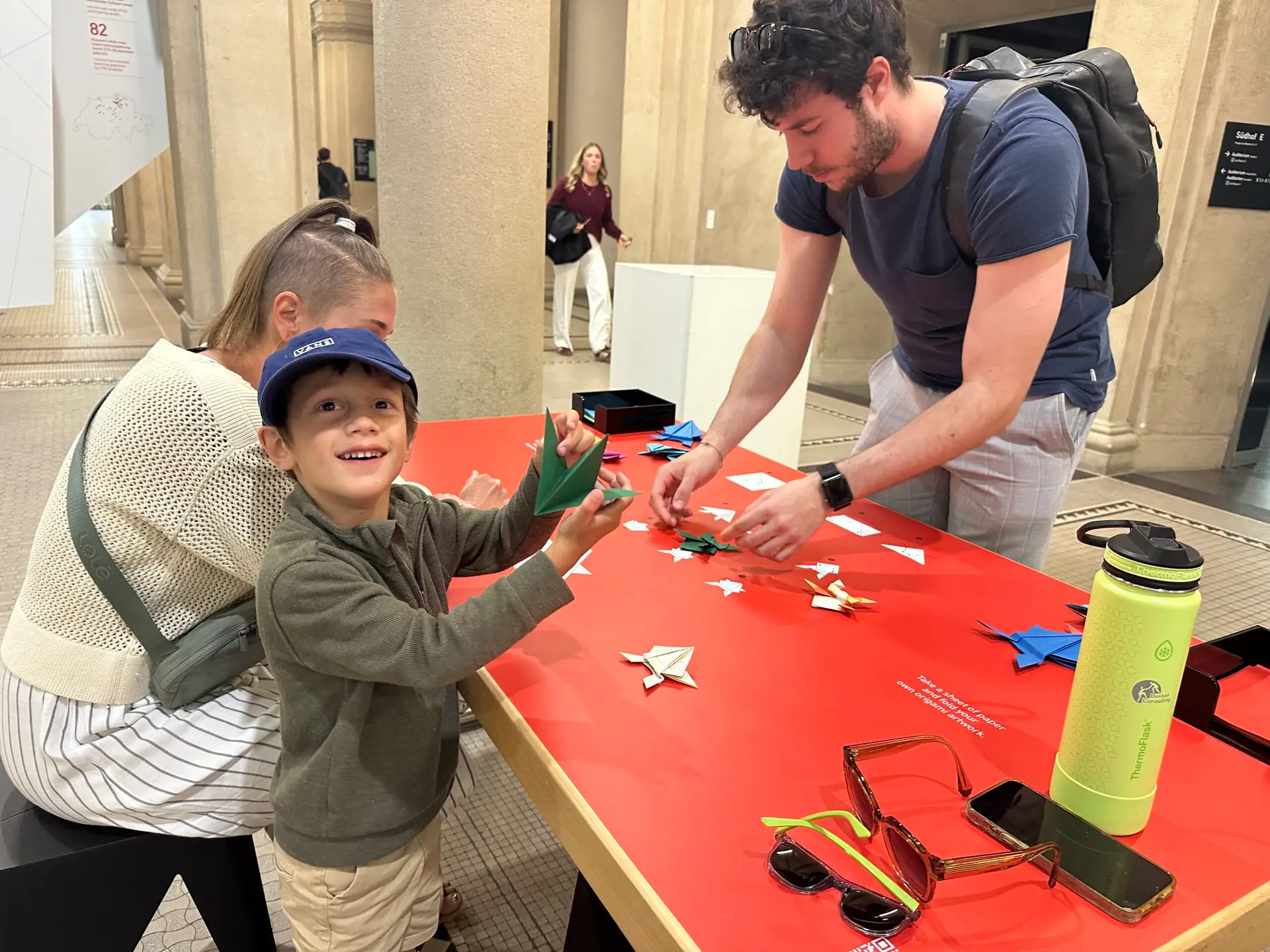Once at ETH, we were greeted—casually—by a robot dog walking along the sidewalk. No big deal 🙂 Inside the main hall, there was a fascinating origami and mathematics exhibit. I got my first glimpse of Angelo’s engineering brain in action when he effortlessly folded an origami frog while reading the instructions upside down. Meanwhile, I was struggling to get past fold two. Impressive young Jedi.