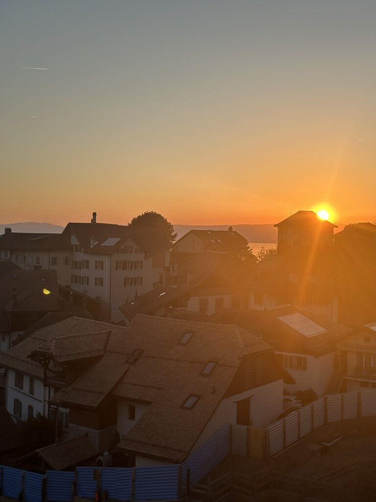 I awoke still riding the high from last night’s Swiss cheese shooting adventure, to another picturesque morning. The sun, through patchy clouds, creates a pattern of mixed blues across the wide expanse of Léman. Kind of looks like Cedar’s paint kit when he gets bored and starts mixing colours. I will never grow tired of this view.