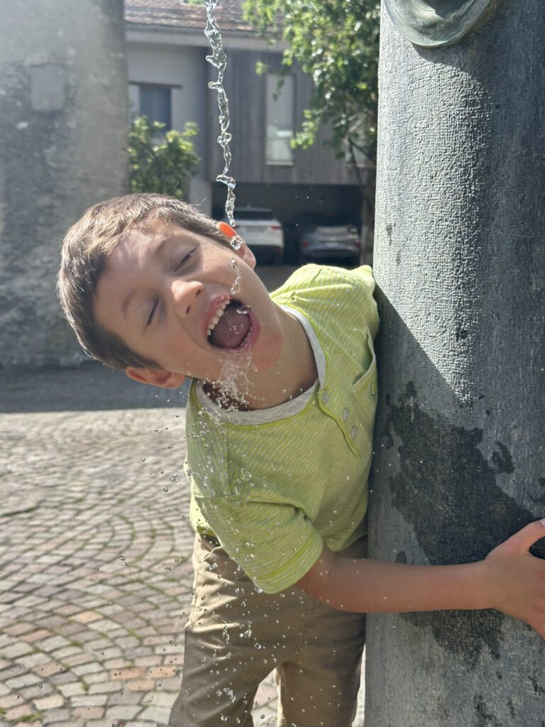 Fun fact: We’re just across the lake from France—Évian-les-Bains, the birthplace of the world-famous Evian mineral water. But honestly? We don’t need it. Here in Chernex, you can still fill your bottle straight from one of the many public, spring-fed fountains—most dating back to the mid-1800s. And Cedar? He’s already become a pro at finding them.